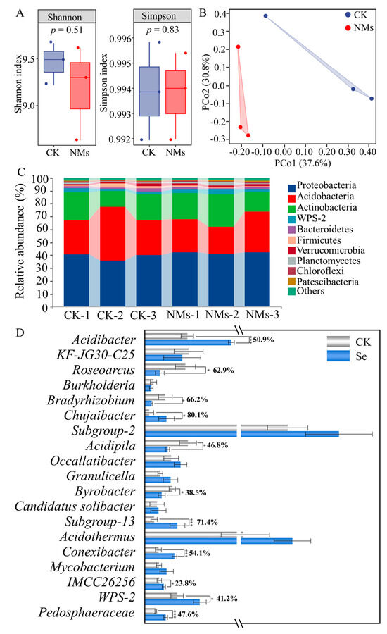 Tea quality depends on tea varieties characterized by different metabolite concentrations. However, it also has a complex relationship with soil texture, soil nutrient composition, and the presence of rhizosphere microorganisms and soil microorganisms [39]. Photosynthate transferred to the roots can further exudate into the rhizosphere in the form of low molecular weight, and these low molecular organic compounds can recruit specific bacteria to influence the structure and function of soil microbial communities, playing a key role in plant–microbe interactions [38,40]. The relative expressions of CsSUT1, CsSUT2, CsSUT3, and CsSWEET1a exposed to Se NMs were increased by 125.8%, 126.3%, 560.5%, and 374.3%, respectively (Figure S2). Sucrose transporter protein (SUT) and hexose and sucrose transporter protein (SWEET) are important for efficient silique loading and the distribution of photosynthetic products for root development [41,42], indicating that more sucrose can be transferred to the roots to supply tea tree growth and development. Significant levels of microbial population differences were observed between the Se NMs exposure treatments and the unexposed control. No significant difference was observed between groups in the Simpson and Shannon diversity index, which might be due to the low effect of 10 mg·L−1 Se NMs on the microbial diversity of tea plantation soils (Figure 5A). In addition, β-diversity was analyzed to reveal the differences in bacterial community composition. The first two principal components of PCoA accounted for 37.6% and 30.8% of the total data variance, respectively, and indicated that there were significant differences in bacterial community structure between Se NMs and unexposed treatments (Figure 5B).