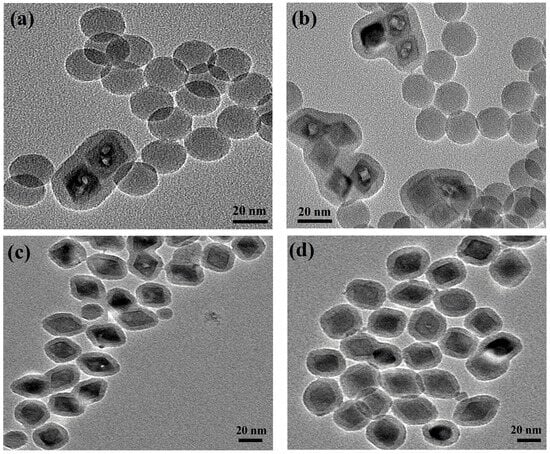 TEM images of UCNPs@SiO2 NPs with different content of UCNPs (a) 2.8 mg, (b) 4 mg, (c) 6 mg, and (d) 7 mg.