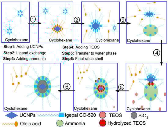 To better understand the silica shell formation on the synthesized UCNPs via the reverse microemulsion process, an illustration schematic was put together as shown in Figure 3. At the first step, Igepal CO-520, a type of detergent, naturally groups together in the cyclohexane solution to form micelles due to its hydrophilic groups. These micelles form because Igepal CO-520 molecules have both water-loving and water-repelling parts. In the oil-like environment of cyclohexane, the water-repelling parts stick out, driving the molecules to cluster together. When oleate-capped UCNPs are introduced into this mix in step number two, an interesting ligand exchange takes place. Some of the oleic acid on the nanoparticles’ surface is replaced by Igepal CO-520, partially integrating the nanoparticles into the micelles. The addition of ammonia is the third and critical step, which causes the Igepal CO-520 micelles to absorb it and grow larger [25,26].