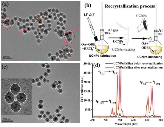 (a) Unwanted UCNP aggregates within a silica shell (highlighted in red dashed circles) during a common silica shell formation before the recrystallization process. (b) An illustration of the wet chemical annealing procedure used for UCNP recrystallization. (c) Post annealing of the synthesized UCNPs in an excess of OA facilitated the successful growth of silica on their surface with single-core UCNPs@silica NPs. (d) UC emission recorded from UCNPs@SiO2 before and after recrystallization process sensing.