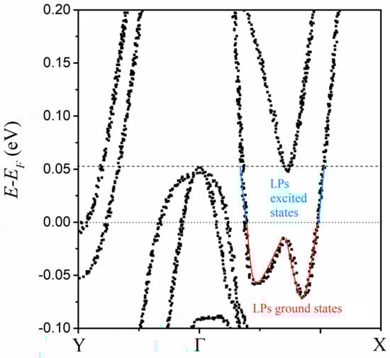 The calculated electronic structure is similar to the reported one [5]. The difference is that the states are not continuous but discrete (Figure 3), which is consistent with the limited quantity of condensed large polarons and the hopping way during the transport process [13]. The discrete state may be responsible for the quantum capacitance. This quantum characteristic of electronic structure is consistent with the nature of 2DEG. LPs condense into the lattices of the Td-MoTe2 bilayer below Tc, and as a result, the bilayer can be regarded as the doping by these specific electron quasiparticles. As a strongly correlated system, these electron quasiparticles induce lattice distortion for the electric polarization. At the same time, they may modify the crystal field, result in the disappearance of the direct bandgap, and trigger the appearance of the indirect band gap.
