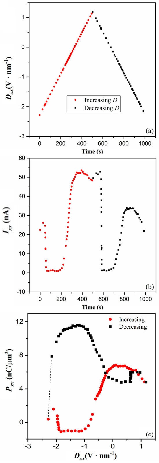 (a) Time dependence of Dxx at 1.7 K. (b) Time dependence of Ixx at 1.7 K. (c) Dielectric hysteresis loop of Pxx and Dxx at 1.7 K.