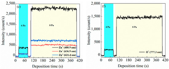 Figure 2a shows the OES spectra of the plasma at 4 Pa and 8 Pa. In addition to the emissions from the Ar radicals, the observed peaks were assigned to the emission from In* (centered at 325.6 nm, 410.1 nm, and 451.0 nm), In+ (centered at 465.5 nm), Ga* (centered at 403.1 nm), Ga+ (centered at 641.9 nm), Zn* (centered at 480.9 nm and 636.9 nm), Zn+ (centered at 621.4 nm), and O* (centered at 777.3 nm). The superscript symbols * and + denote neutral excited radicals and positive charged ions (cations), respectively. The emission intensities of the plasma species at 8 Pa are much stronger than those at 4 Pa due to the more frequent collision with the hot electrons and other species, leading to the more excited/ionized plasma species. Specifically, the oxidizing ability of the oxygen species with a higher excitation rate at a higher deposition pressure was expected to increase, leading to the suppression of the oxygen vacancy defect density, thereby lowering the carrier concentration in the film. Figure 2b presents a photo image of the discharge plasma observed from the viewing port of the process chamber and the detection set of the OES instrument viewed from inside the process chamber (the inset photograph). The intensity variations of each species over time during the deposition of Ch.-III are illustrated in Figure 2c–f. The results show that the OES intensities remain stable at each deposition pressure over the whole deposition process.