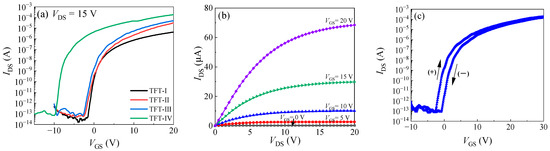 (a) The transfer curves for the TFTs with different channels; (b) the output curves; and (c) the dual sweep characteristics for TFT-III.