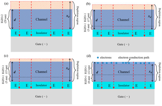 A mechanism was proposed to explain the Vth -shift results of the TFTs with the channel prepared under different conditions, as depicted in Figure 5. The average Nc in the channel was modulated by a different thickness combination of IGZO-1/IGZO-2. As a result of the negative bias exerted on the gate electrode, the free carriers were repelled from the channel–insulator interface by the electrical field, forming a depletion region in the channel. The depletion width (xd) is negatively related to the average Nc in the channel. For TFT-I–TFT-III, the depletion width was thicker than the channel thickness (d); thus, the channel can always be completely depleted to turn off the TFT, thereby keeping the Vth at around 0 V. For TFT-IV, the depletion width reduced to a value lower than the channel thickness due to the increase of Nc; hence, a conduction path was formed at the back-channel region beyond the depletion region to form a current between the S/D electrodes, thereby leading to a significant negative shift in the Vth.