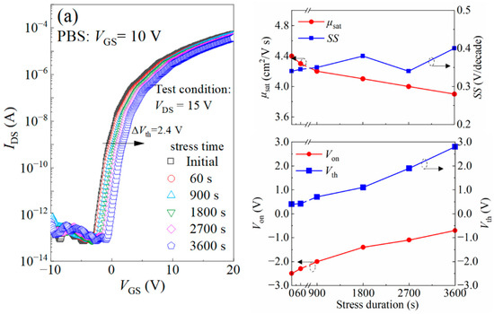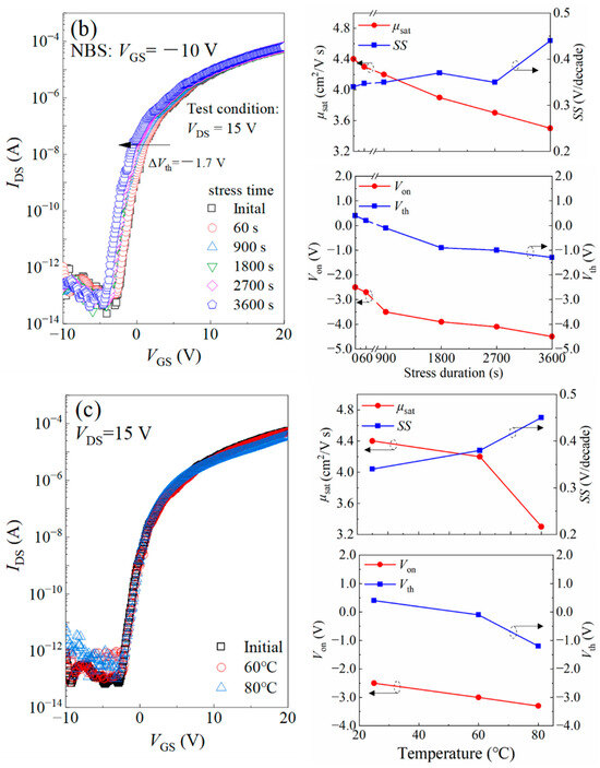 The development of the transfer curves and the corresponding key performance parameters of the TFT-III under (a) positive bias stress (PBS, VGS = +10 V), (b) negative bias stress (NBS, VGS = −10 V), and (c) under thermal bias with stress durations or testing temperatures.