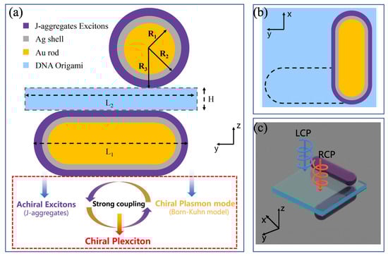Studying the chiroptical response of chiral plexcitons is a crucial step in designing familiar and easily accessible nanosystems composed of chiral plasmonic nanoparticles and J-aggregate molecules. As depicted in Figure 1a, we designed an L-shaped nanorod dimer to serve as a chiral plasmonic nanoparticle, which is widely applied in experiments as a model with 3D spatial chirality. In electromagnetic coupling analysis, this L-shaped nanorod dimer can be reduced using the Born–Kuhn model, introduced by Yin et al. [] to describe the chiroptical response of this kind of chiral plasmonic nanoparticle. Specifically, two identical Au@Ag nanorods were assembled on opposite sides of a DNA origami sheet, and the long axes of the nanorods are perpendicular to each other. Then, to develop chiral plasmonic nanoparticles into CPMs, we coated the L-shaped nanorod dimer with J-aggregate molecules, which have low losses and a strong electric dipole moment in the visible region and are often used as exciton materials to form CPMs. Figure 1b,c show top and left views of the finalized chiral plexcitonic system, which facilitates our understanding of the spatial configuration of the system. A detailed description of the model and simulations is given in Appendix A.