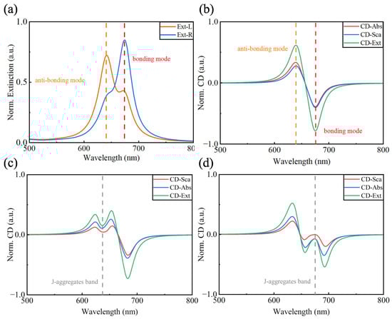 In general, it is rather challenging to adjust and reconfigure the chirality of chiral nanoparticles once they have been prepared or assembled, as in the case of the L-shaped nanorod dimer we discuss here, which can be assembled utilizing methods such as DNA origami [,] or atomic force microscopy (AFM)-based manipulation []. If one wants to change the chiroptical response through structural alterations, it inevitably involves steps such as recreating the DNA origami template, re-synthesizing nanorods with different aspect ratios and reassembling them, or AFM-based manipulation, which is usually prohibitively expensive and time-consuming. Through the strong chiral light–matter interaction between J-aggregate excitons and chiral plasmonic nanoparticles, we can significantly alter the chiroptical response of the system. On the experimental side, this method is easy to implement and avoids the complicated process of fabricating new samples, and on the theoretical side, the method can control the chiroptical responses of the system more accurately. As shown in Figure 2c,d, significant changes in CD spectra in terms of the appearance of new peaks and peak splitting can be observed, and these changes follow the properties of the chiral plexcitons. The phenomenon of strong coupling in these CD spectra also provides new spectroscopic research ideas for understanding strong light–matter coupling.