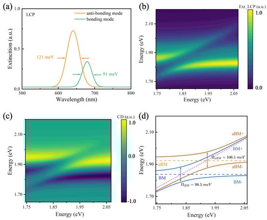 This agrees well with the theoretical calculation in Figure 3d. However, only the Rabi splitting of the bonding mode is apparent in the extinction spectra in Figure 3b. A similar phenomenon was observed in the research of Zhu et al. []. Here, we can presume that this is because BM has a stronger local field (see Appendix A Figure A1), so the strong-coupling criterion is easier to satisfy. The anti-crossing behavior is more straightforward to observe in the spectra. In contrast, the aBM and BM resonances are relatively close to each other, as shown in Figure 3a, which leads to another anti-crossing phenomenon of aBM hidden in the extinction spectra. This is why only one instance of Rabi splitting is apparent in the extinction spectra in Figure 3b. It is also implied that the overlap of some modes can seriously hamper the observation and analysis of strong-coupling phenomena in the extinction spectra. In contrast, the CD spectra can distinguish the effects of these modes. In a way, it is a handy and practical spectroscopic measurement to observe strong-coupling phenomena through CD spectra.