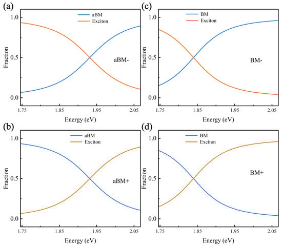 Hybrid fraction (Hopfield coefficients) of the chiral plexcitonic system calculated from Equation (1). (a,b) depict the proportion of excitons and plasmons in the aBM− and aBM+ energy branches; (c,d) depict the proportion of exciton and plasmons in the BM− and BM+ energy branches. The orange and blue solid lines indicate the hybrid energies of the excitons and plasmons, respectively.