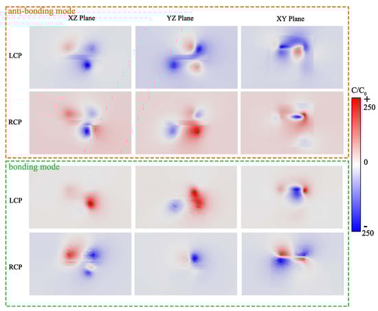 The field distributions of anti-bonding mode and bonding mode under RCP and LCP excitations, respectively.