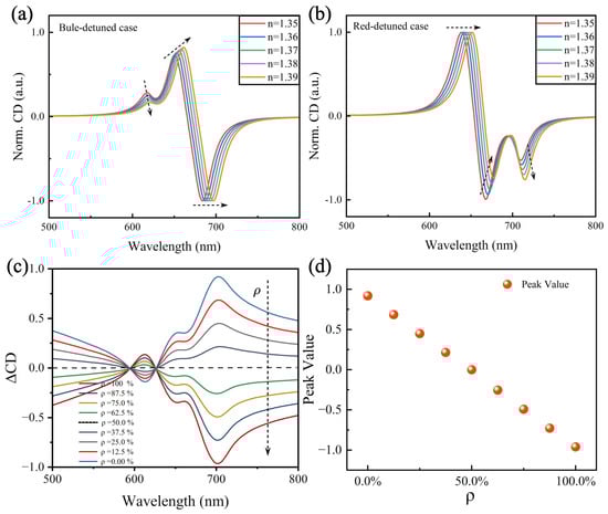 Influence of refractive index n and enantiomer ratio of chiral sample on the CD spectrum of the chiral plexcitonic system. (a,b) show the CD spectra of the chiral plexcitonic system in blue- and red-detuned cases, where n increases from 1.35 to 1.39. The sensitivity values are found to be nm/RIU and nm/RIU. (c) shows the spectra of the chiral plexcitonic system with an increasing enantiomer ratio . (d) Peak value of spectrum as a function of , showing a linear relationship.