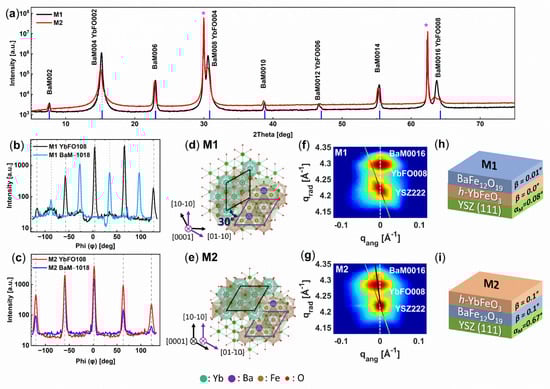 (a) Diffraction patterns of the heterostructures M1(BaM/YbFO/YSZ) (solid black curve) and M2(YbFO/BaM/YSZ) (solid red curve), substrate peaks are shown with (*) symbol. (b,c) Azimuthal scans of asymmetric reflections BaM(−1018) and YbFO(108) for M1 and M2, respectively. (d,e) Visualization of the in-plane rotation relationship of the atomic layers relating to the crystal structures as it is simulated along the [0001] direction for M1 and M2, respectively. (f,g) 2D-HRXRD reciprocal space maps containing the BaM(0016), YbFO(008), and YSZ(222) diffraction spots. (h,i) Schematic presentation of the heterostructures M1(BaM/YbFO/YSZ) and M2(YbFO/BaM/YSZ) with two different stacking sequences.