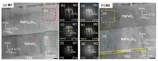 In order to investigate the quality of the individual layers in the heterostructures M1(BaM/YbFO/YSZ) and M2(YbFO/BaM/YSZ), we compare the angular diffraction profiles of the BaM0014 and Yb006 reflections for M1 and M2 in Figure 2a,b, respectively. We found that the angular diffraction profile of the (0014) BaM reflection is broader for M1(BaM/YbFO/YSZ), which indicates that the defect density is probably higher in the BaM layer of the M1(BaM/YbFO/YSZ) heterostructure. We applied the mosaic model to the BaM and YbFO layers where the individual layers are composed of mosaic blocks misoriented due to defect formation. The variation in the FWHMang broadening determined for the BaM and YbFO reflections is plotted as a function of the reflection order 00l in Figure 2c,d, respectively. By applying the Williamson–Hall approach [] for the FWHMang versus 00l plot, we derived the degree of misorientation of the BaM mosaic blocks from the slope. We found that αBaM_M1 = 0.74° is higher than αBaM_M2 = 0.41°, which confirms a higher defect density in the BaM layer of M1 in comparison to the BaM layer of M2. The cross-section TEM images of M1 and M2 in Figure 2e,f indicate a higher number of defect boundaries which are illustrated by yellow dashed curves for the BaM layers. The lateral sizes of BaM mosaic blocks vary in the range from 29 to 154 nm for M1 and in the range between 46 and 169 nm in the case of M2. The X-ray diffraction analysis in combination with TEM characterization enabled us to conclude that the BaM layer in M1 contains more defect boundaries than in the case of M2. However, a similar approach applied to the YbFO layers demonstrated similarities in the quality of the YbFO layer for both heterostructures despite the degree of misorientation being slightly different (αYbFO_M1 = 0.64° and αYbFO_M2 = 0.53°). Figure 3a,h show HRTEM micrographs of the M1 and M2 multiferroic systems, which include the different orientations of the different individual layers such as YSZ, YbFO, and BaM. For both M1 and M2 bilayer systems, BaM and YbFO were grown with the [001] direction parallel to the [111] direction of YSZ. A high-resolution STEM HAADF image of the YbFO/YSZ(111) interface in the M1 heterostructure is given in Figure S2a where an interlayer with a thickness of Th = 2.5 nm and a different atomic arrangement can be seen that in addition exhibits a different image contrast than in the YbFO layer. Furthermore, there were no detectable atomic steps at the YbFO/YSZ(111) interface.