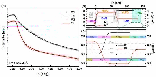 The specular X-ray reflectivity (XRR) was measured by using a Rigaku Smartlab diffractometer. The data were measured using Cu-Kα1 radiation and a parallel beam with an X-ray mirror. The data were evaluated by the well-known method for the XRR analysis of multilayers with rough interfaces developed by Parratt []. The used model for fitting the XRR curves of M1 and M2 is described as following: a rough YSZ substrate, a thin interlayer between the substrate and the first layer, the first layer with rough interface, and a rough top layer. The fit was carried out by using a self-written script based on the least square fitting algorithm. All the fitting parameters are summarized in Table 2a.