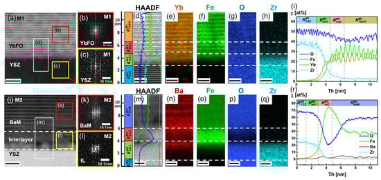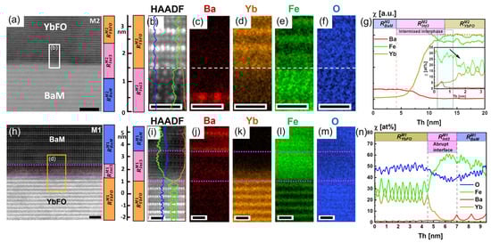 In Figure 5a,j, high-resolution STEM HAADF images are given of the YbFO layer grown on YSZ(111) for M1(BaM/YbFO/YSZ) and BaM directly deposited on YSZ(111) for M2(YbFO/BaM/YSZ), where, in the rectangular regions marked by white boxes, combined STEM/EDXS analyses were performed. The corresponding STEM HAADF images and quantified X-ray maps for the elements Ba, Fe, Yb, Zr, and O are shown in Figure 5d–h for M1 and Figure 5m–r for M2. The obtained element-specific line profiles of M1 and M2 are given in Figure 5i,r. Figure 5i displays the profiles of Ba, Fe, Yb, Zr, and O for the heterostructure M1 in a region near the YbFO/YSZ interface, limited by the white box and crossing through the interface which is illustrated by the dashed magenta lines in Figure 5a. The latter contains a disturbed structure where a different atomic arrangement appears as a mixture between the pure YbFO layer and the pure YSZ substrate. Here, from the STEM HAADF image in Figure 5d and from the EDXS maps (Figure 5e–h) and the corresponding elemental profiles, we can distinguish four characteristic ranges RM1YSZ, RM1int1, RM1int2, and RM1YbFO. The region RM1YSZ = Th < 2.75 nm represents the pure substrate YSZ(111), while the region RM1YbFO = Th > 4.6 nm corresponds to a pure YbFO layer of M1 with corresponding slight concentration oscillations of Yb, Fe, and O. The transition region comprises RM1int1 = 2.75 nm < Th < 4.6 nm, where the interdiffusion of Zr into the YbFO layer took place as measured by the simultaneous increase in Yb and Fe and decrease in Zr. Another region, RM1int2 = 4.6 nm < Th < 6.5 nm, defines the deposited YbFeO film in M1 near the interface with residual Zr atoms from the substrate, which are not detected at Th = 6.5 nm away from the YSZ substrate. Therefore, the element concentration profile in RM1int1 has the same behavior as in RM1YSZ with a progressive decrease in the Zr concentration, while RM1int2 displays similar elements with a residual concentration of Zr.