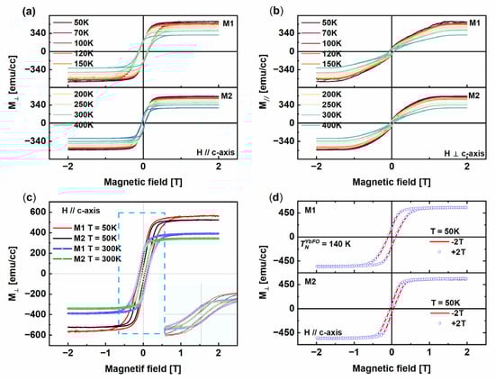 The out-of-plane (OOP) hysteresis loops recorded for the temperature range T = [50–400 K] for M1 and M2 are compared in Figure 7a, while the in-plane (IP) hysteresis loops are displayed in Figure 7b. The latter shows a higher IP area for the hysteresis loops in M1. Moreover, the IP coercivities and the remenance of M1 are higher than in the case of M2. Similarly, for the whole temperature range, we found that the OOP area, which corresponds to the dissipation energy, is large in the case of M1. One can deduce that the growth sequence changes the hard magnet M1(BaM/YbFO/YSZ) into a soft one M2(YbFO/BaM/YSZ) with a smaller area of the hysteresis loop (i.e., smaller hysteresis loss) and a lower coercivity field Hc⊥. Furthermore, independently of the stacking sequence, the OOP hysteresis loops display single magnetic hysteresis curves rather than the step-like hysteresis loop for the whole measured temperature range T = [50–400 K]. This is in accordance with the abrupt interface BaM/YbFO in M1(BaM/YbFO/YSZ) (Figure 6n) and the slightly intermixed interface YbFO/BaM in the case of M2(YbFO/BaM/YSZ) (Figure 6g). For better clarity, in Figure 7c, the OOP of the heterostructures M1(BaM/YbFO/YSZ) and M2(YbFO/BaM/YSZ) are compared for T = 50 and 300 K. In order to investigate the existence of interfacial magnetic coupling (EB) below the Neel temperature of YbFeO3 (TN ≅ 125 K) [,,] for M1(BaM/YbFO/YSZ) and M2(YbFO/BaM/YSZ), field-cooled hysteresis loops were measured after cooling to 50 K below the Neel temperature of the YbFO layer (i.e., TYbFON ≅ 140 K) under a field of +2 T and −2 T. The results given in Figure 7d do not show any detectable exchange bias (EB) for the M1 and M2 heterostructures at T = 50 K where the systems M1 and M2 correspond to (FM/CAFM) and (CAFM/FM), respectively. We did not consider to perform the EB measurement since the Neel temperature of YbFO was TYbFON ≅ 140 K, and the systems M1 and M2 underwent a transition to (FM/PM) and (PM/FM), respectively, where the EB was not relevant.