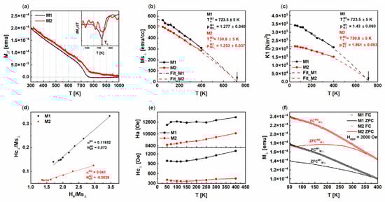 The Curie temperature TFSc of the BaM single crystal in the free-standing state was previously determined by Shirk et al. at Tc = 740 K []. In our case, the stacking sequence changed the in-plane residual strain in the BaM layer from compressive εM1BaM// = −1.3% in M1 to tensile in M2 εM2BaM// = 1.3%, while the out-of-plane residual strain increased from εM1BaM⊥ = 0.29% to εM2BaM⊥ = 0.48% (see Table 1c). The Tc was determined for M1 and M2 from the derivatives minimum dM/dT of the temperature–moment dependence M//(T) curve (see Figure 8a). We found TM1c = 723.5 ± 5 K and TM2c = 714.7 ± 5 K for the BaM layer in M1 and M2 which was lower than Tc = 740 K for BaM in the free-standing state. The lowering of the Tc of the strained film in comparison to the bulk has been also reported by Gan et al. in the case of epitaxial SrRuO3 films [].