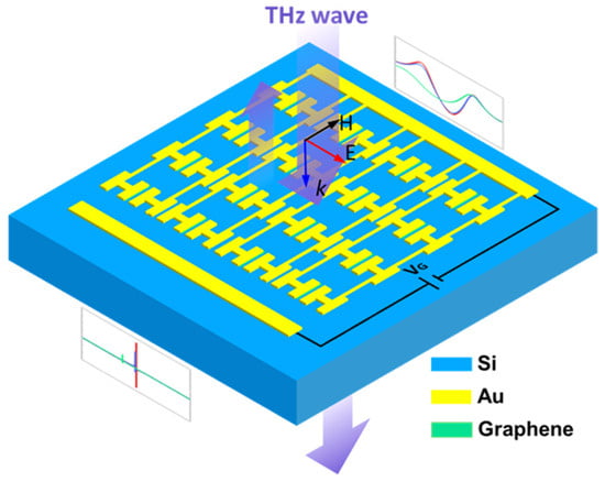 The device was fabricated on a 200 μm thick, high-resistivity silicon substrate, which included 40 × 40 units. Conventional lithography was used to define the pattern. The positive photoresist used in this experiment was AZ5350. Following this, 5 nm titanium (Ti), as the adhesion layer, and 100 nm gold (Au) films were deposited with electron beam evaporation (EBE) and lifted off with acetone. Next, a piece of monolayer CVD graphene film coated with PMMA was transferred onto the pre-patterned substrate and patterned by conventional photolithography and the inductively coupled plasma (ICP) etching process. The samples were cleaned in acetone to remove the photoresist residuals.