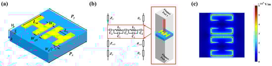 (a) The structural configuration of the TCMAs, where key geometric parameters are defined as follows: Px = 250 μm, Ws = 30 μm, and Lc = 45 μm. (b) The ECM of the proposed TCMAs, with Z0 set at 377 Ω. (c) Electric field diagram of the proposed H-shaped TCMAs at 261 GHz.