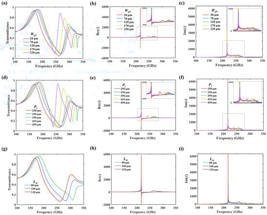 (a–c) Frequency spectrum of transmittance and the permittivity, respectively, with varying structural parameters Wg0. (d–f) Frequency spectrum of transmittance and the permittivity, respectively, with varying structural parameters Py. (g–i) Frequency spectrum of transmittance and the permittivity, respectively, with varying structural parameters Lm.