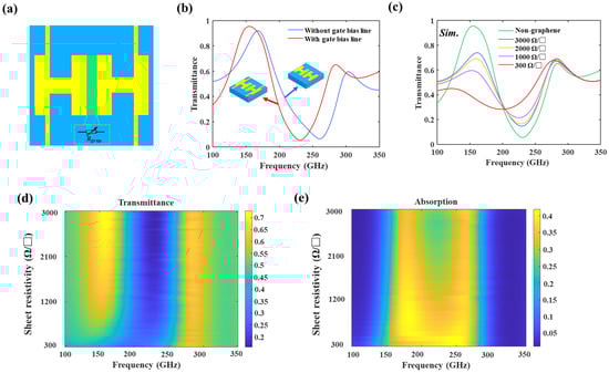 (a) TCMAs integrated with graphene. (b) Comparison of transmittance with and without the gate bias lines. (c) Simulated transmittance without the graphene and with graphene as ρs sweeps from 3000 to 300 Ω/□ (the corresponding resistor is from 500 to 50 Ω). The color plot of transmittance (d) and absorption (e), respectively.