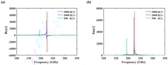 (a,b) A comparison of the real and imaginary parts of permittivity with the graphene sheet resistance of 3000, 2000, and 300 Ω/□.