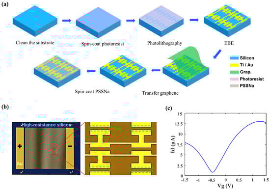 (a) Device fabrication process. (b) The image of the fabricated device. (c) The graphene Fermi–Dirac point DC test is conducted with a channel length of 300 μm and a width of 350 μm.
