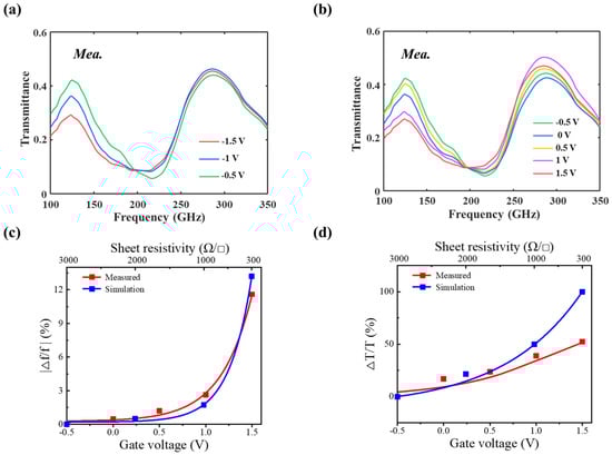 The measured transmittance of the fabricated device under gate bias sweeping (a) from −1.5 V to −0.5 V and (b) from −0.5 V to 1.5 V. (c,d) The measured and simulated modulation depths of resonant frequency and transmittance, respectively.