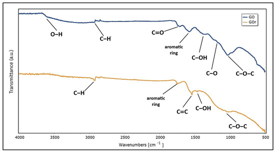 The presence of oxygen functional groups, especially hydroxyl, epoxy and carboxyl, which are key to the functionality of GO [82], was confirmed by FTIR analysis. The existence of these groups demonstrates the good oxidation of graphite. Figure 4 shows the spectrum of GO and GOr to compare and analyze their structural and functional differences.