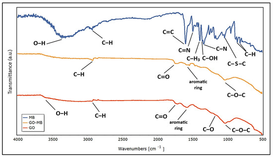 Fourier transform infrared spectra of MB, GO-MB and GO.