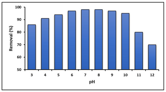 Figure 6 illustrates the ability of graphene oxide (GO) to remove MB dye as a function of the solution pH. This figure reveals that the dye can be adsorbed at acidic pHs below PZC (pHPZC = 5.5). As the pH of the dye solution increases, the adsorption of cationic MB dye molecules on the GO surface is enhanced. However, Figure 6 also shows a decrease in adsorption capacity starting at pH > 10, which could be due to the hydrolysis of GO [83]. According to the literature, GO is stable at pH values between 4 and 10 [84].