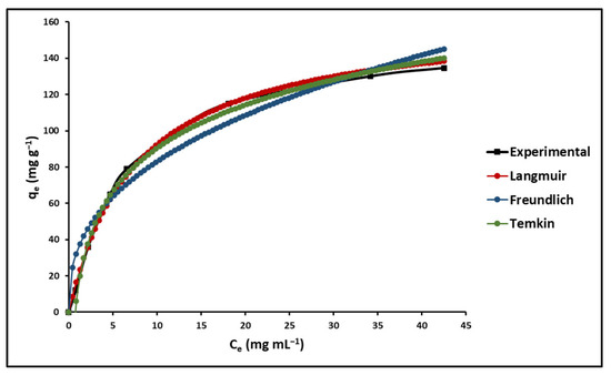 The effect of the initial concentration of the dye is closely related to its concentration and the sites present on the adsorbent surface [85]. The effect of the initial concentration of MB on the adsorption capacity of GO was determined by measuring the amount of residual MB in the solution via UV-Vis spectrophotometry at λ = 623 nm and applying Equation (1), as shown in Table 1. The adsorption maximum of GO was calculated using equilibrium isotherms at different initial concentrations of MB, from 1.5 to 50 mg L−1. The fit of the experimental data is presented in Figure 7 for the Langmuir, Freundlich and Temkin isotherm models, according to Equations (2)–(4), as shown in Table 1, respectively. According to Figure 7, a better fit was demonstrated with the Langmuir isotherm model.