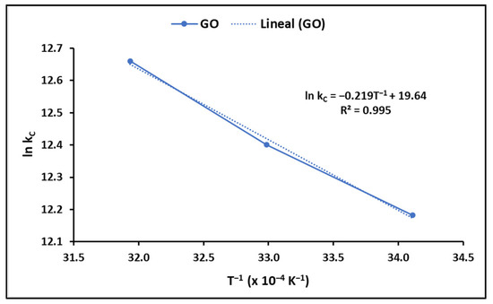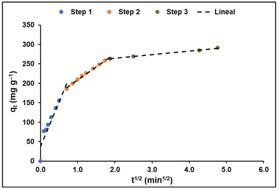 On the other hand, the adjustment of the intraparticle diffusion model (Figure 10) shows, according to Equation 13 of Table 1, that the adsorption of MB on GO takes place in three stages: an initial stage of fast speed (k1 = 231.45 mg g−1 min−1/2), another, slower, intermediate stage (k2 = 66.85 mg g−1 min−1/2), and a final stage that tends to equilibrium (k3 = 9.28 mg g−1 min−1/2). The values of the kinetic constants for each stage, as well as the values of the effective diffusion coefficients Df and Dp, calculated using Equations (14) and (15) of Table 1, respectively, are shown in Table 4.