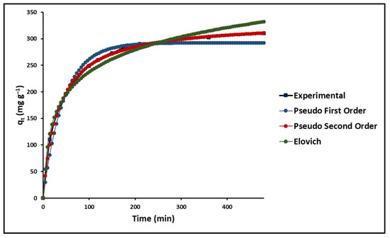 In this study, the kinetics of the adsorption process of MB on GO were investigated. For this, three models were used: the pseudo-first-order model (Lagergren), the pseudo-second-order model (Ho), and the Elovich Model. Figure 9 shows the fit of the experimental data based on Equations (10)–(12), as presented in Table 1.