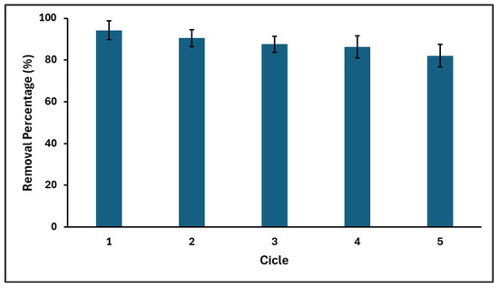 Since the recycling and regeneration of the adsorbent is very important in practical applications, GO recycling experiments were carried out for five consecutive cycles. After each cycle, the materials were washed with methanol to desorb the adsorbed dye and were again subjected to the adsorption process, maintaining the same operational conditions as the previous cycle. Figure 11 shows that the recovery efficiency of GO is generally high, and the adsorption capacity is little affected over five consecutive adsorption–desorption cycles. In fact, after the fifth cycle, the MB adsorption capacity of GO decreased by only 12%. From these results showing a high recycling efficiency, it is suggested that the GO synthesized in this study is suitable for practical application.