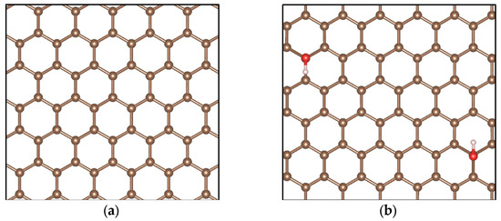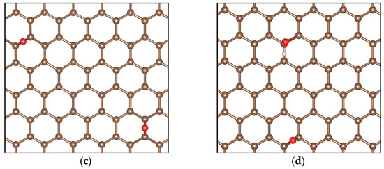 As can be seen in Figure 12, the hydroxyl group forms a bond perpendicular to the plane of graphene, causing changes in bond lengths and angles. On the other hand, the epoxy group establishes a bond with two adjacent carbon atoms, which generates distortions in the graphene structure. The structures obtained in our calculations agree well with those reported in other theoretical studies [47,48].
