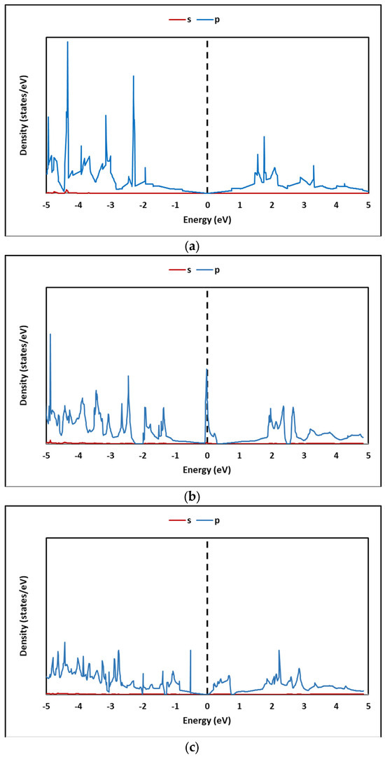 In this study, the electronic properties of pristine graphene and graphene oxides were determined by analyzing the band structure (SB) and the density of states (DOS). Figure 13 shows the band structures (SB) for the configurations of (a) pristine graphene (G) and the graphene oxides—(b) GOL, (c) GOXI, and (d) GOL/GOXI—along the high-symmetry directions A—L—M—Γ—A—H—K [89]. This figure shows that the presence of oxygenated functional groups in the graphene monolayers does not shift the Dirac point regarding the Fermi level.