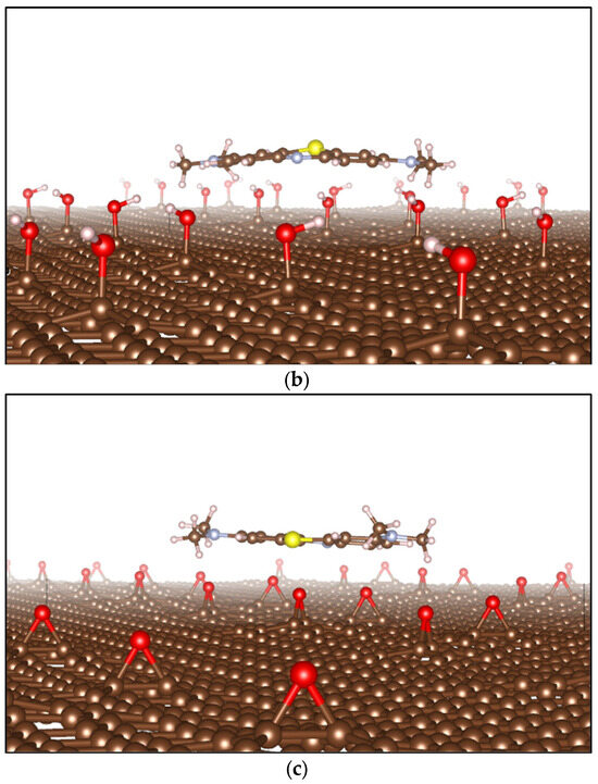 The simulation of methylene blue (MB) molecule adsorption onto GO surfaces utilized optimized lattice parameters: a = 22.22 Å, b = 38.48 Å, and c = 16.00 Å, with the angles between the lattice vectors set to <90° × 90° × 120°> [70]. The dynamic configuration adopted point symmetry P1, and the Brillouin zone was sampled using Γ-centered (2 × 1 × 2) Monkhorst–Pack grids [71]. Simulations were performed under non-spin-polarized conditions, with atomic positions relaxed until forces on the atoms were reduced to below 0.01 eV/Å. The GO model was represented by a p(5 × 5) supercell containing 370 carbon atoms, two oxygen-containing groups, and a 15 Å vacuum region in the out-of-plane direction. Surface energies (γs) of the GO structures were calculated following Equation (17), as outlined in Table 1 [72,73]. The adsorption energy (Eads) of MB molecules on the surfaces of graphene oxide was determined using Equation (18) in Table 1 [74,75].