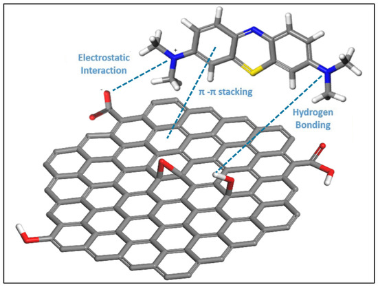 Recently, interest in the use of graphene-based materials such as methylene blue for water decontamination has increased, leveraging their large surface area and porous structure for efficient dye molecule adsorption, with removal efficiencies exceeding 95% [38,39,40]. Experimental and computational studies, including density functional theory (DFT) analyses, have been conducted to elucidate the adsorption capacity of MB on graphene, GO, and rGO, providing insights into the molecular adsorption mechanisms and predicting material adsorption capacities [41,42,43,44,45,46].