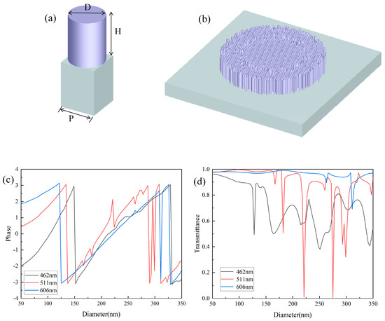 In this paper, the finite difference time domain method is used for simulation. The diameter was swept from 50 to 350 nm. Figure 2c,d show the phase and transmittance of three wavelengths, respectively. Multiple −π to π periods are achieved by changing the diameter of unit cells, which means that more than one nanopillar can be selected at a certain location for the target phase. A phase library corresponding to the diameters of the nanopillars was constructed. As shown in Figure 2c,d, the transmittance remains at a high level except for the falling peaks.