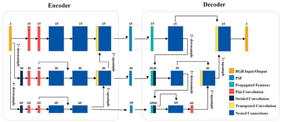 In the encoder, a series of convolutional neural networks are employed to transform the three-channel RGB image into feature tensors. The input layer achieves resolution reduction through convolution to capture the rich feature information from the ground truth. Three different convolution kernels are 1 × 1, 3 × 3, and 5 × 5, with 15, 30, and 60 channels and correspondence to the original resolution [29], 2× downsampled resolution, and 4× downsampled resolution. At different resolutions, feature extraction is performed using residual blocks and full convolutions. The low-resolution feature maps are concatenated with the up-scale features by up-sampling. Performing feature extraction at lower resolutions may allow the network to show features at a global level, while the images extracted at the original resolution focus more on local details. Residual structures and concatenation layers are utilized to fuse different resolution features to obtain comprehensive image information.