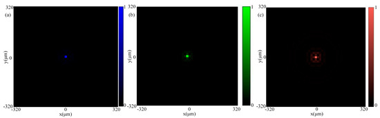 (a) The relative intensity of the PSF of 462 nm; (b) the relative intensity of the PSF of 511 nm; and (c) the relative intensity of the PSF of 606 nm.