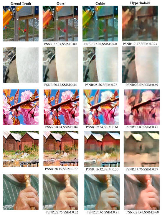 The final output image results are shown in Figure 7. The first column is the ground truth. The second column is the output image reconstructed in this paper. In contrast, the third and fourth columns are the reconstructed images based on the cubic and polynomial phases, respectively. It can be seen that the quality of the second line of restored images is significantly better than that of the second and third lines, both in terms of color and detail. The artifacts, blur, and noise at the edge of the images have been effectively restored and eliminated. Although it cannot be restored to the ground truth, it still demonstrates the good recovery capability of our imaging system.
