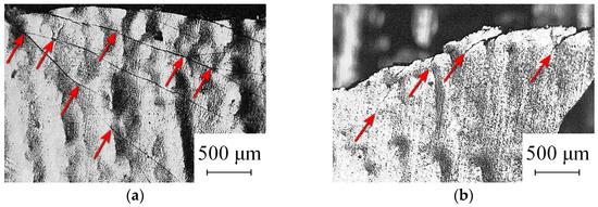 Micrographs in the fracture zone illustrating: (a) specifics of cracks branching, the arrows indicate the branching points; (b) specifics of destruction in the area of the vertices of branched and stopped cracks, the arrows indicate the vertices of stopped cracks.