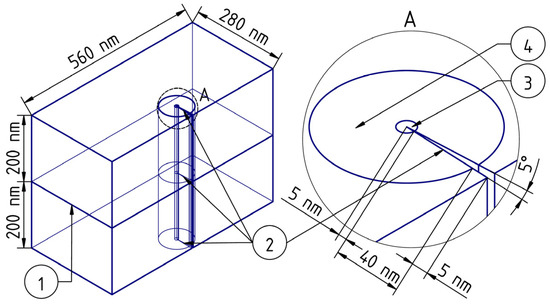 A schematic representation of the simulated sample is shown in Figure 4. The area of the crack tip local self-heating caused by plastic effects is represented on the remote element A with a large magnification (element 3 of Figure 4). The self-heating area and the material around it are characterized by the highest temperature gradient; therefore, the density of the finite element method grid is increased there (element 4 of Figure 4). Geometrically, this area represents a cylinder, one of the bases of which is shown in the remote element A of Figure 4. According to the preliminary model experiments, it was found that the maximum temperature gradient was fixed in the space bounded by the cylinder with a base diameter of 90 nm, as shown in Figure 4. In Figure 4, the nanocrystalline/amorphous ribbon is on top, while the fusible metal alloy is on the bottom.