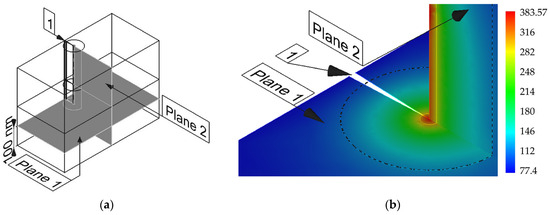 (a) The geometry of the sample in the area of the crack tip, indicating the areas where the temperature distribution was analyzed; (b) scalar temperature fields in planes 1 and 2; 1—crack.