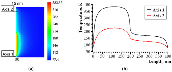 In addition to the features of heating in the plane perpendicular to the plane of the crack (Figure 5 and Figure 6a), it is necessary to analyze the temperature distribution along lines parallel to the plane of the growing crack and located in front of its tip (Figure 6 and Figure 7). These lines intersect the melting plane of nanocrystalline/amorphous tapes and fusible material at right angles (Figure 4 and Figure 6a). Thus, it is possible to identify the features of heating the material in the contact area of an amorphous nanocrystalline and low-melting alloy. It seems important to understand the process of plastic deformation initiation both on the basis of Equation (1) and in view of the thermal activation nature of elementary acts of plastic deformation. Figure 6a shows the geometry of the analyzed area. The heating pattern in plane 2 is shown in Figure 6b and Figure 7a. The dependence curves No. 1 and No. 2 shown in Figure 7b are built on axes lying in plane 2 and perpendicular to plane 1 (Figure 6a). Herein, axis No. 1 is located at a distance of 1.5 nm from the crack tip, and axis No. 2 is located at a distance of 15 nm from it (shown in Figure 7a).