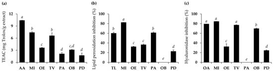 Antioxidant activities in terms of Trolox equivalent capacity (TEAC) (a) and lipid peroxidation inhibition (b), along with the hyaluronidase inhibitory activities (c) of ascorbic acid (AA), Trolox (TL), oleanolic acid (OA), and natural oils from M. integrifolia seed (MI), O. europaea (OE), T. vulgare germ (TV), P. americana (PA), O. biennis (OB), and P. dulcis (PD). Different letters (a, b, c, d, and e) denote statistical differences among the groups, determined through one-way ANOVA followed by the Tukey post hoc test (p < 0.05).