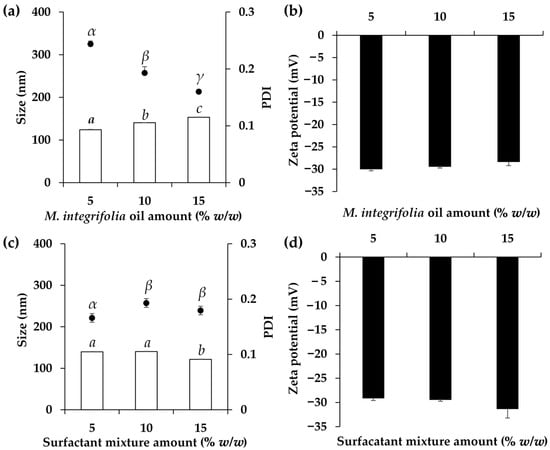 The internal droplet size and polydispersity index (PDI) (a) and zeta potential (b) of M. integrifolia oil nanoemulsions developed using various concentrations of oil and internal droplet size and PDI (c) and zeta potential (d) of M. integrifolia oil nanoemulsions developed using various concentrations of surfactant mixture. Different letters (a, b, and c) and Greek alphabet (α, β, and γ) denote statistical differences among the groups, determined through one-way ANOVA followed by the Tukey post hoc test (p < 0.05).